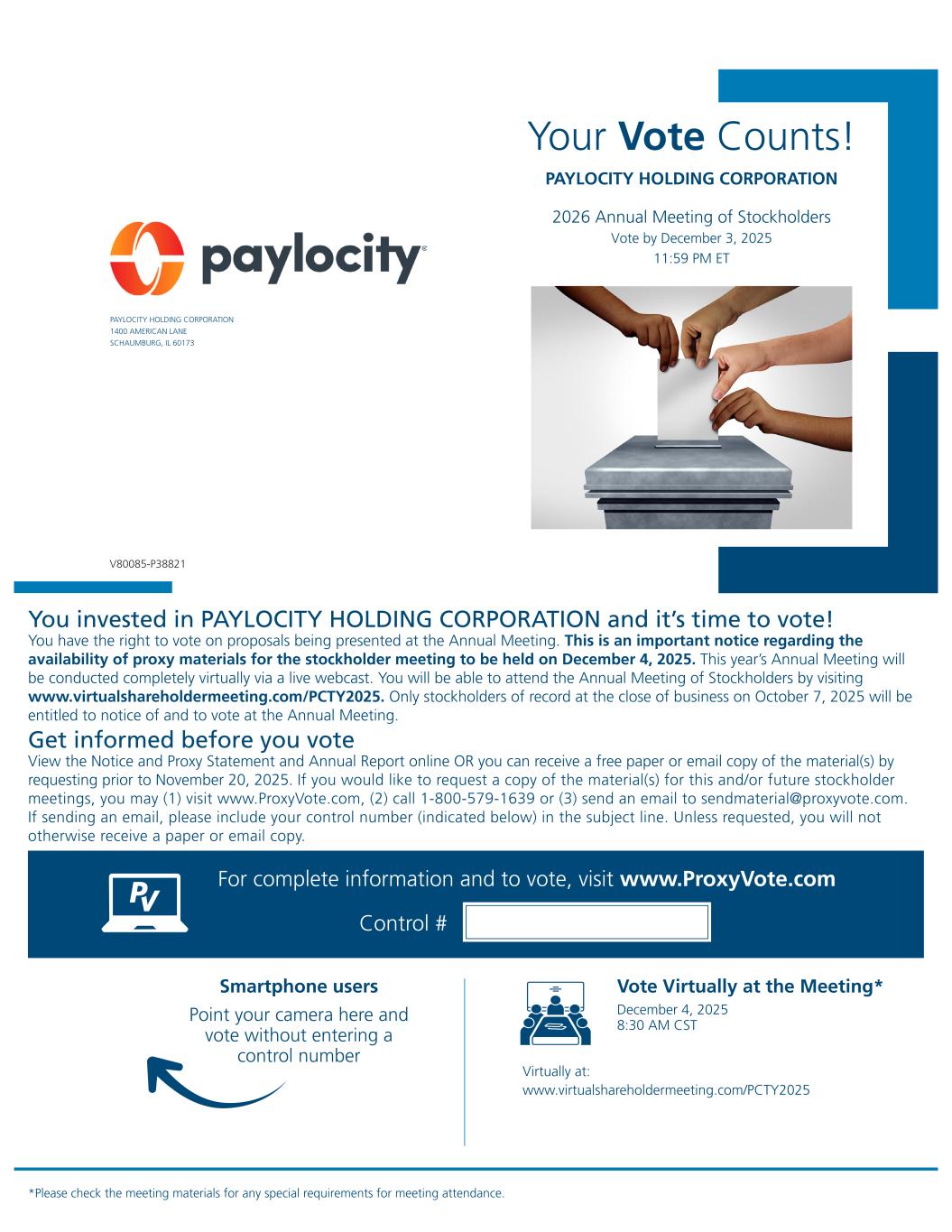 Your Vote Counts! *Please check the meeting materials for any special requirements for meeting attendance. Smartphone users Point your camera here and vote without entering a control number For complete information and to vote, visit www.ProxyVote.com Control # V80085-P38821 PAYLOCITY HOLDING CORPORATION PAYLOCITY HOLDING CORPORATION 1400 AMERICAN LANE SCHAUMBURG, IL 60173 2026 Annual Meeting of Stockholders Vote by December 3, 2025 11:59 PM ET You invested in PAYLOCITY HOLDING CORPORATION and it’s time to vote! You have the right to vote on proposals being presented at the Annual Meeting. This is an important notice regarding the availability of proxy materials for the stockholder meeting to be held on December 4, 2025. This year’s Annual Meeting will be conducted completely virtually via a live webcast. You will be able to attend the Annual Meeting of Stockholders by visiting www.virtualshareholdermeeting.com/PCTY2025. Only stockholders of record at the close of business on October 7, 2025 will be entitled to notice of and to vote at the Annual Meeting. Get informed before you vote View the Notice and Proxy Statement and Annual Report online OR you can receive a free paper or email copy of the material(s) by requesting prior to November 20, 2025. If you would like to request a copy of the material(s) for this and/or future stockholder meetings, you may (1) visit www.ProxyVote.com, (2) call 1-800-579-1639 or (3) send an email to sendmaterial@proxyvote.com. If sending an email, please include your control number (indicated below) in the subject line. Unless requested, you will not otherwise receive a paper or email copy. Vote Virtually at the Meeting* December 4, 2025 8:30 AM CST Virtually at: www.virtualshareholdermeeting.com/PCTY2025