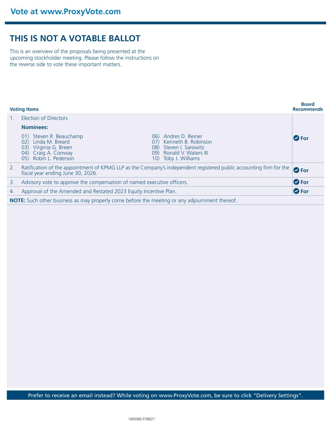Vote at www.ProxyVote.com Prefer to receive an email instead? While voting on www.ProxyVote.com, be sure to click “Delivery Settings”. Voting Items Board Recommends V80086-P38821 THIS IS NOT A VOTABLE BALLOT This is an overview of the proposals being presented at the upcoming stockholder meeting. Please follow the instructions on the reverse side to vote these important matters. 1. Election of Directors For Nominees: 01) Steven R. Beauchamp 02) Linda M. Breard 03) Virginia G. Breen 04) Craig A. Conway 05) Robin L. Pederson 06) Andres D. Reiner 07) Kenneth B. Robinson 08) Steven I. Sarowitz 09) Ronald V. Waters III 10) Toby J. Williams 2. Ratification of the appointment of KPMG LLP as the Company’s independent registered public accounting firm for the fiscal year ending June 30, 2026. For 3. Advisory vote to approve the compensation of named executive officers. For 4. Approval of the Amended and Restated 2023 Equity Incentive Plan. For NOTE: Such other business as may properly come before the meeting or any adjournment thereof.